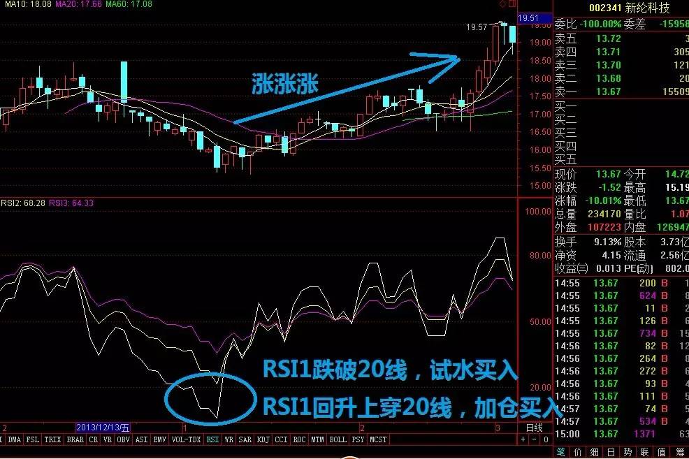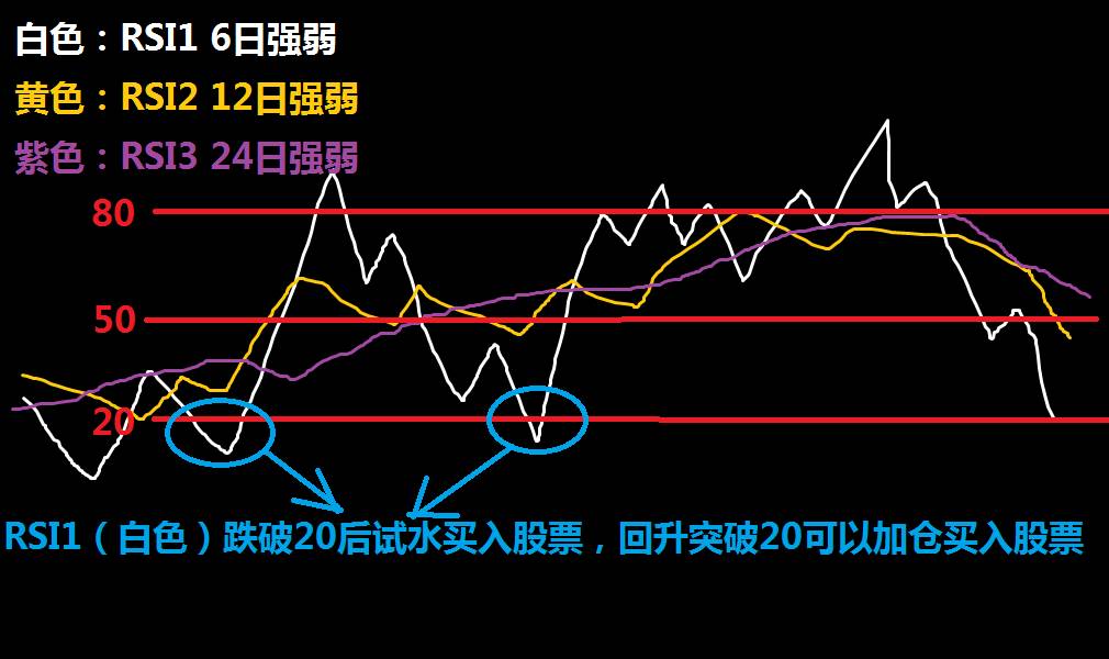 当RSI1(白色线)跌破20时,说明市场进入了超卖状态,股价继续下跌的空间已经不大,这时投资者可以试探性地少量建仓(试水,错误的话记得止损)。当RSI1(白色线)见底回升突破20时,则可以加仓买入股票。