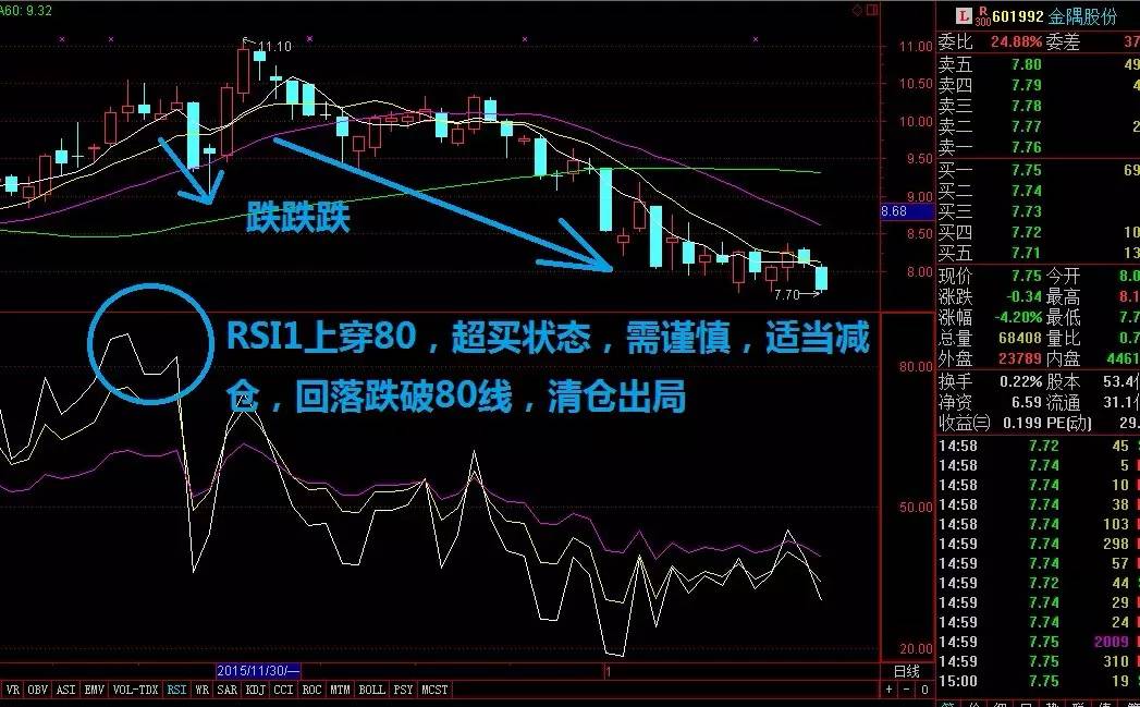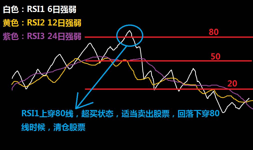 3、RSI1(白色线)从高位跌破80,卖出股票信号