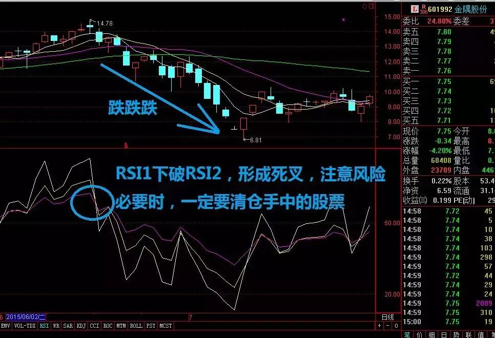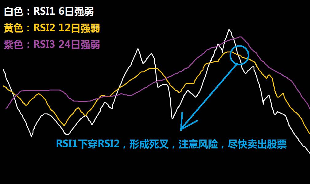4、RSI1与RSI2高位死叉,卖出股票信号