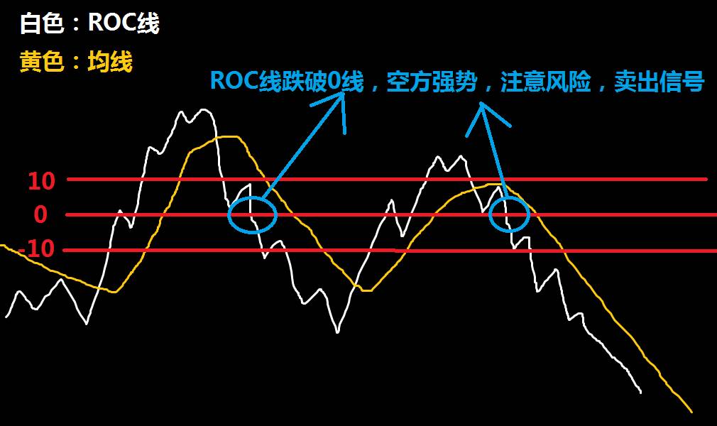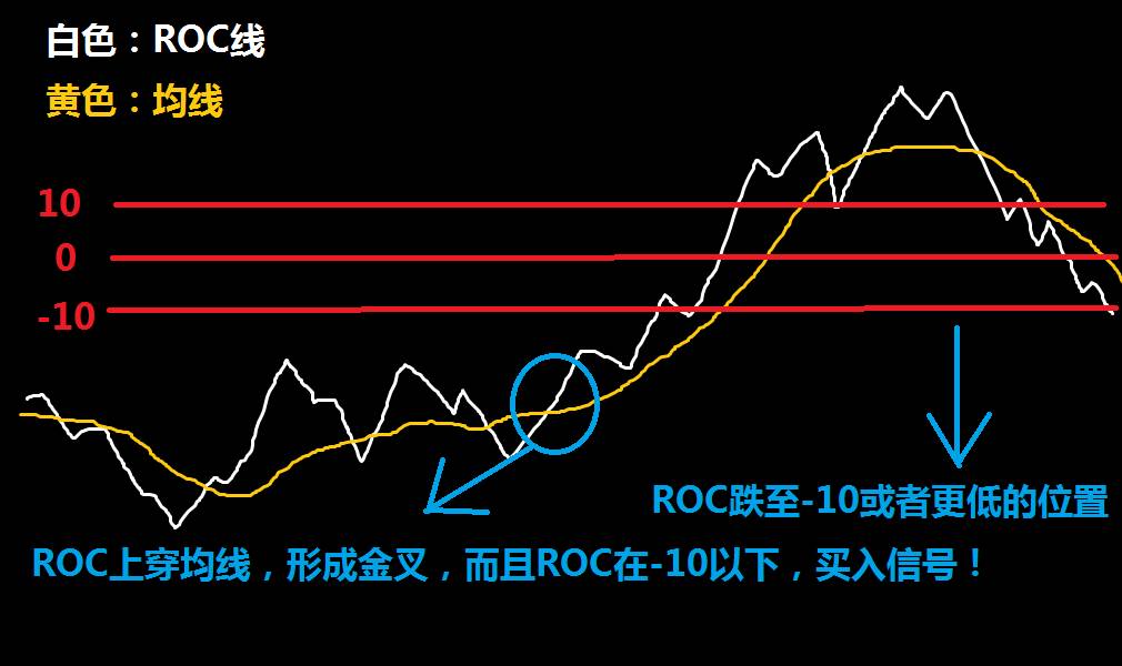 当ROC跌至-10或者更低的位置,ROC指标自下而上穿越指标均线,出现金叉,则买点出现,是买入的机会,通常短线会有一波的涨幅。如果金叉出现在-20位置处,则买点的可靠性更大。
