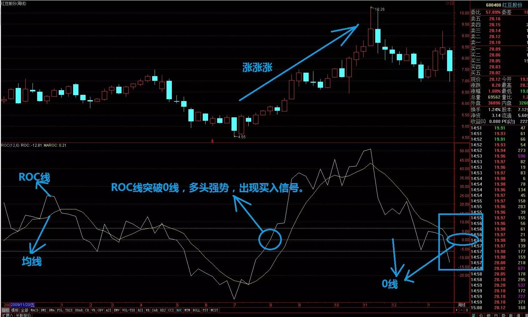 当ROC指标升至0值上方,表示当天的收盘价已经超过了12个交易日的收盘价,说明股价走势转强,是一个买入的信号。