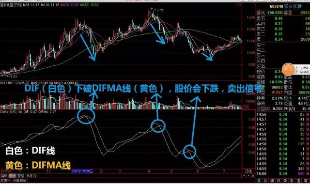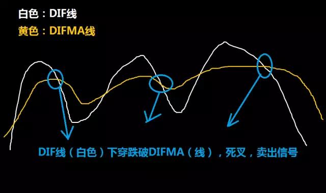 当股价经过长期上涨行情后,受到上方压力和上涨动力的减弱,DIF线向下跌破DIFMA线,形成“死亡死叉”,说明股价将要进入下跌行情,这时要减仓卖出股票。股价经过一段下跌行情进入盘整阶段,但是由于市场做空力量大,DIF线再次向下跌破DIFMA线,这时股价还会继续下跌,必要时清仓离场,持币观望!
