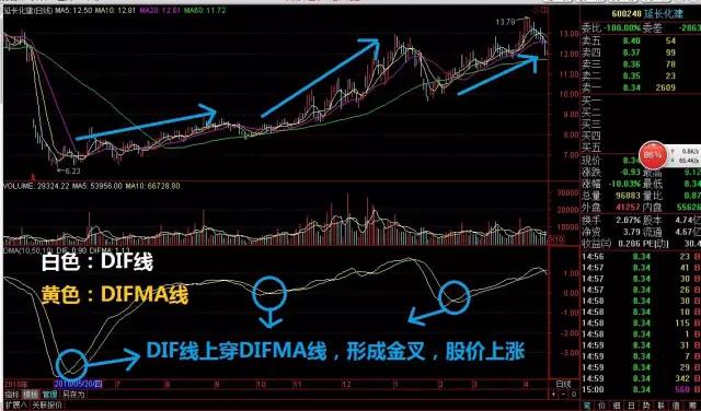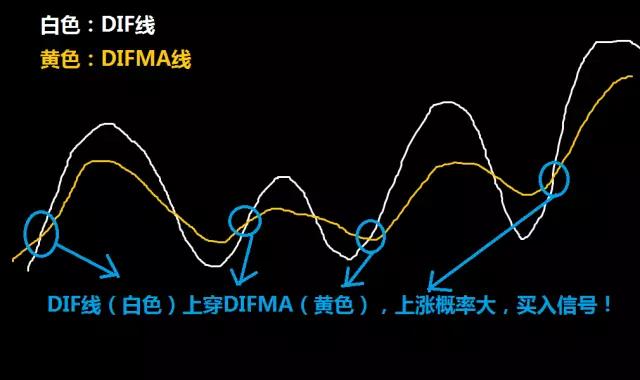 当股价在经过长期下跌行情后,DIF线向上突破DIFMA线,称为“黄金金叉”,说明市场开始转强,下跌趋势结束,可以买入股票。当股价在经过一波上涨行情或者盘整行情后,DIF线再次上穿DIFMA线,说明股价还会上涨,可以补仓或者持股待涨。