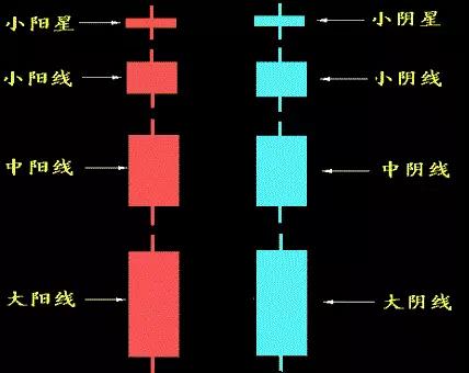 根据开盘价与收盘价的波动范围:可将K线分为极阴、极阳,小阴、小阳,中阴中阳和大阴、大阳等线型。极阴线和极阳线的波动范围在0.5%左右;小阴线和小阳线的波动范围一般在0.6–1.5%;中阴线和中阳线的波动范围一般在1.6-3.5%;大阴线和大阳线的波动范围在3.6%以上。