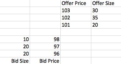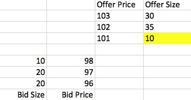 什么时候会产生交易呢?有两种情况,第一是任一方发出市价单(Market Order),比如一个买家发出一张单量为10的市价单,就可以买到卖方在101价格上挂的10份,这个交易成功之后,Order Book会变成这样: