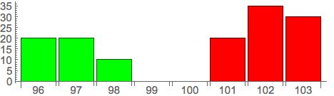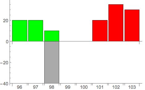 Bid表示买家,Offer表示卖家,这张报价单表示买卖双方发出的所有报价单(Limit Order)。这张表才是高频交易最关心的信息。任意时刻,买家的出价总是低于卖家(比如这里的98对101)。所以报价虽然一直在变化,但是只有报价是不会有任何成交的。