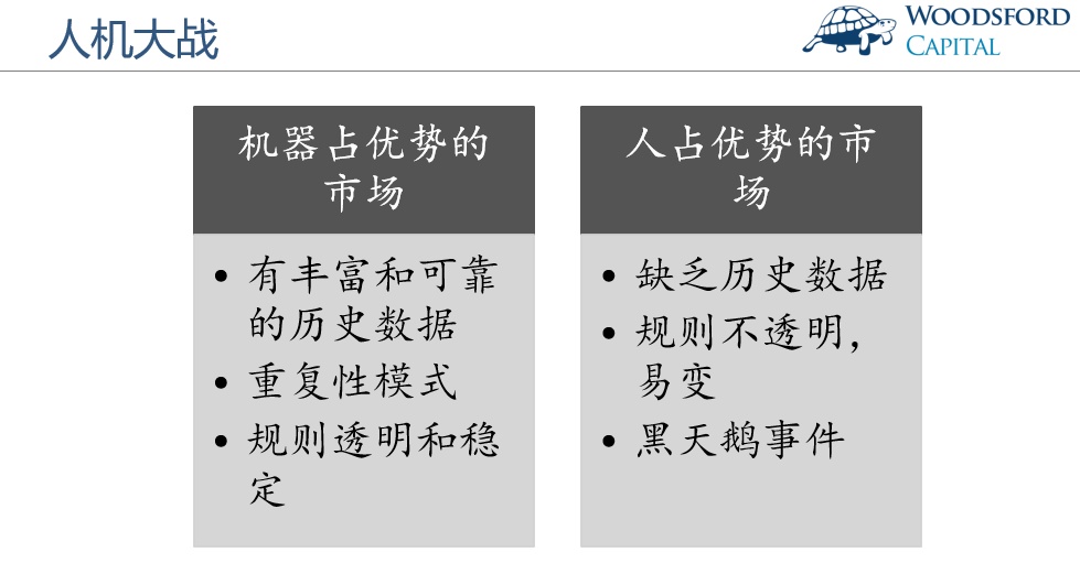 举例来说,如果某国有不少上市公司都在财务数据上作假,虚报盈利,那么用机器学习的方法,很可能会“垃圾进、垃圾出”,得到不少错误的结论。而如果一位基金经理经验丰富,对做假账的方法比较熟悉,那么他就能更快和更准确的看出这些假冒数据背后的端倪,也更能够离真相更进一步。