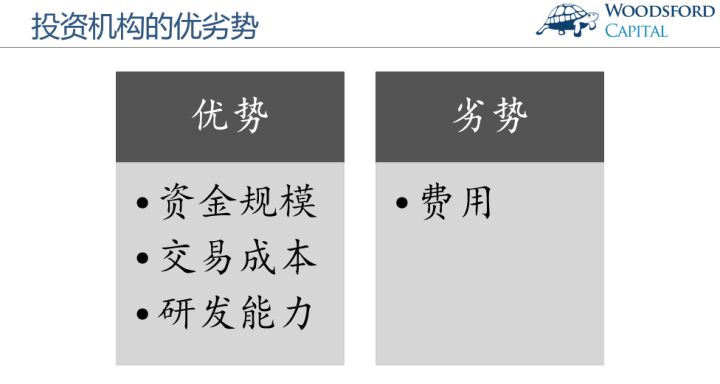 和机构相比,个人投资者最大的优势在于费用低廉。要维持一个大型投资机构的运转,撑起一个大型的投资团队(包括投资经理、研发、数据、交易、后台、法律等),需要非常高昂的费用。在这些费用之上,基金公司还需要赚钱,因此他们需要向投资者收取高昂的投资费用(比如2/20)。而如果是在家里自己交易的个人投资者,就可以避开这些费用。对于想要提高自己投资回报的投资者来说,降低费用非常重要,有兴趣的朋友可以百度搜索“伍治坚+投资费用”做扩展阅读。