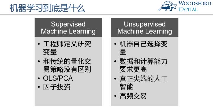 有人管的机器学习,是指工程师定义研究的变量。这种“机器学习”,其实和传统意义上的量化交易策略研究没有多大区别。很多这样的机器学习,用的还是最小二乘法(OLS)和主成分分析(PCA)这样的统计方法,而这些统计方法至少已经被用了几十年。一些机构放上“机器学习”的标签,主要就是为了追求一个噱头,在营销上让人产生“高大上”的错觉。