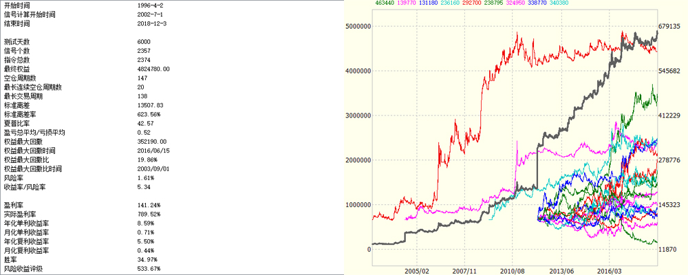 本期分享一个混沌操作法策略。由于国内金融市场发展滞后,研究这种方法的人很少,本期分享的策略希望能够达到抛砖引玉的作用,提高大家对这种方法的兴趣。混沌操作法是由鳄鱼线、碎形、动量、加速、均衡线,五种技术指标构成。本策略逻辑是:如果价格在鳄鱼嘴之上,只多不空,并且将多头持仓的止损位置向上移动。如果价格在鳄鱼嘴之下,只空不多,并且将空头持仓的止损位置向下移动。