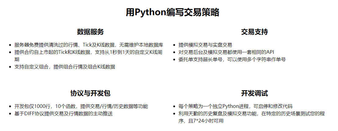 TqSdk 是一套依托 DIFF协议 (Differential Information Flow for Finance) 的开源 python 框架. 它支持用户使用较少的工作量构建量化交易或分析程序.