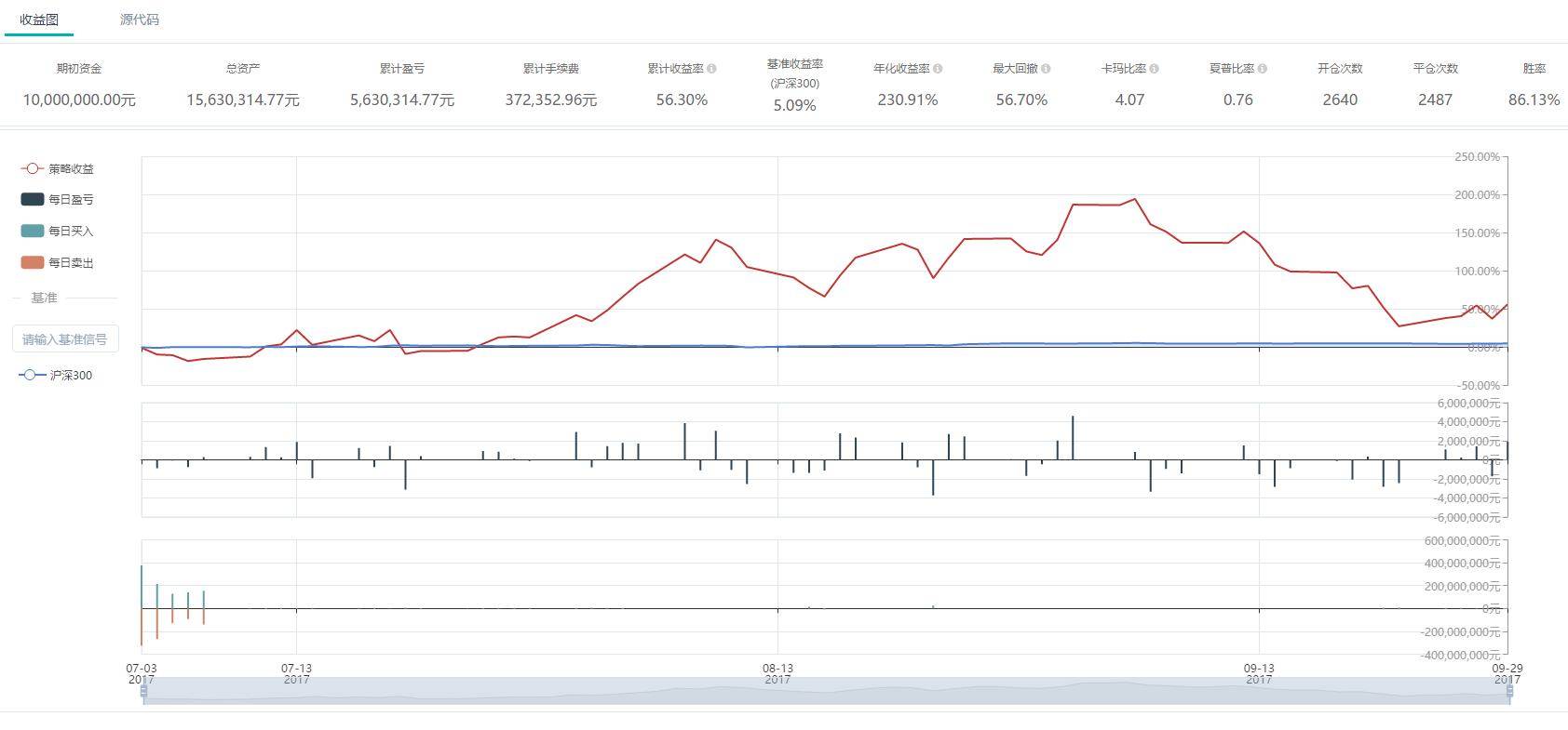 本策略首先计算了过去300个价格数据的均值和标准差 并根据均值加减1和2个标准差得到网格的区间分界线, 并分别配以0.3和0.5的仓位权重 然后根据价格所在的区间来配置仓位(+/-40为上下界,无实际意义): (-40,-3],(-3,-2],(-2,2],(2,3],(3,40](具体价格等于均值+数字倍标准差) [-0.5, -0.3, 0.0, 0.3, 0.5](资金比例,此处负号表示开空仓)