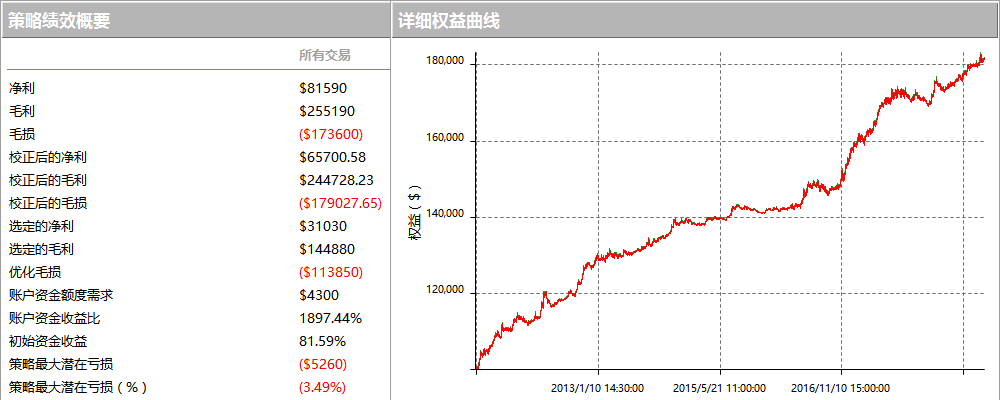 这是一款中长线的交易系统,属于趋势追踪型策略,它在谷物、肉类、金属、能源、外汇、股指期货等8个品种之间灵活运转,通过长线地追踪趋势来获得盈利。而由于它同时在多个不相关或相关性很低的市场中进行交易,因此只需在一种或几种市场中获得趋势的高额盈利,就能弥补在其他不稳定市场中的亏损。它的交易频率一般是每年交易某一品种3-4次,60%的时间都持仓,平均每笔交易持仓60天。