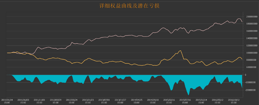 统计过去一段时间收盘价的最大值出现的位置与最小值出现的位置, 当满足过去一段时间收盘价的最小值出现的位置晚于收盘价的最大值出现的位置, 同时使用均线进行简单过滤,当前价格需要在均线价格之上,则进场做多,空头的条件与之相反。 出场使用3:1的合约价值止盈止损比,并滚动式提高止盈止损。 在沪深300股指期货与螺纹钢期货组合投资。 测试时间段:2011年1月1日到2017年1月1日。
