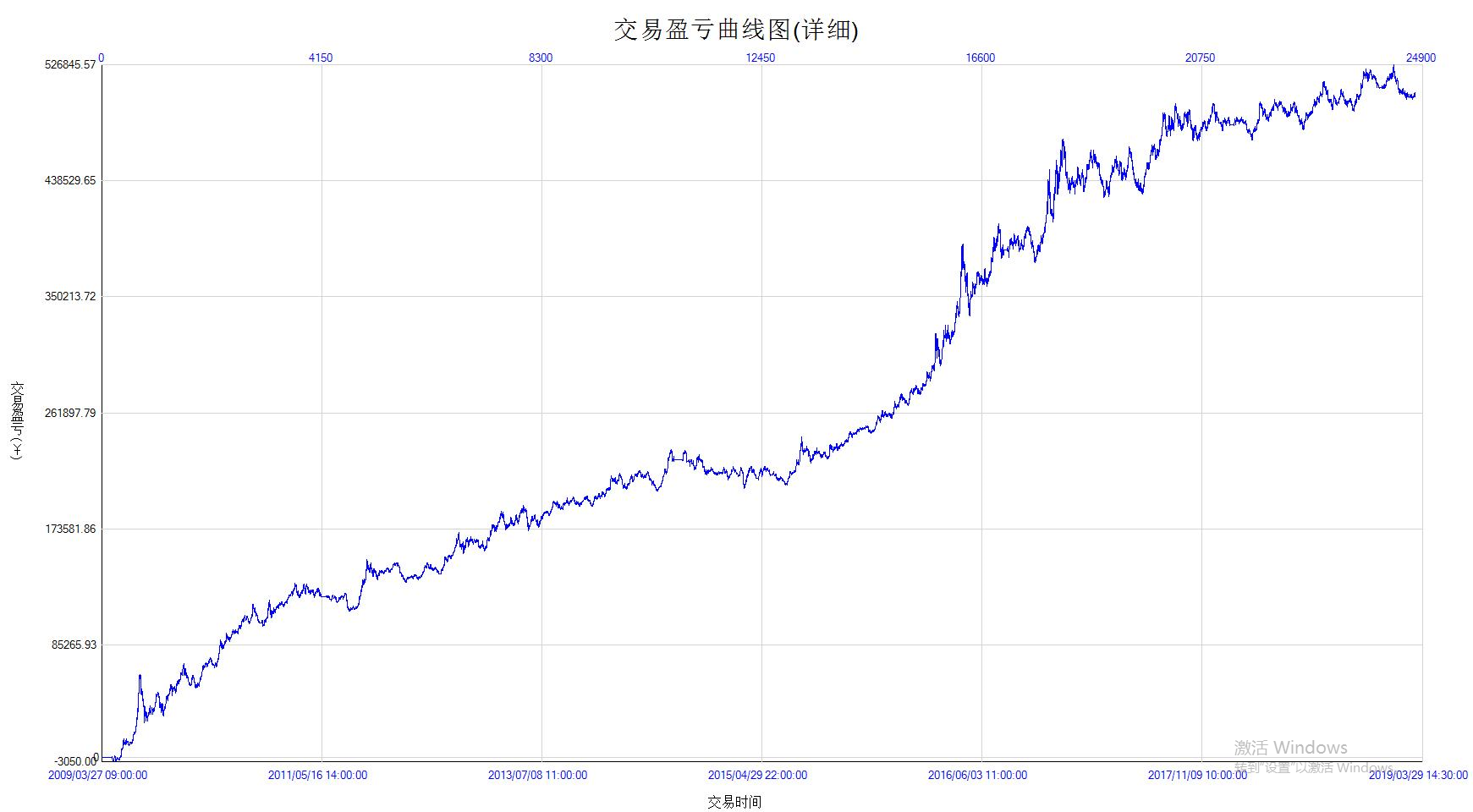 我们测试一个交易策略,要尽可能地接近实盘交易,因此这里把手续费设置为交易所手续费的1.5倍,并加1个最小变动价位的滑点。在小时级别测试螺纹钢指数时间周期2009/03/27 09:00:00 - 2019/03/29 14:30:00。对于以收盘价报单的方式,测试结果如上图。