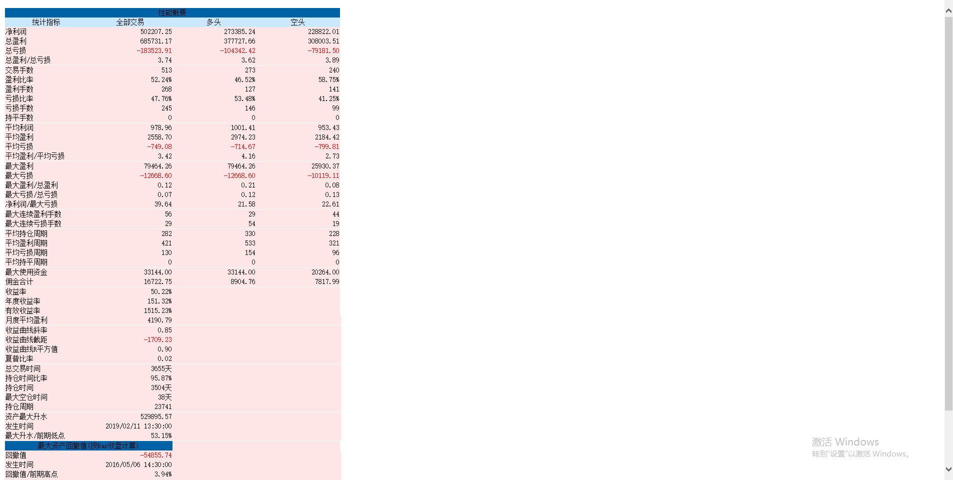 从上图的回测资金曲线上看,整体测试曲线比较良好。每年都盈利。胜率超过50%,趋势策略的胜率通常不会太高,一般情况下都30%~40%左右。平均盈利/平均亏损为3.42,这个比值大于3,是比较好的