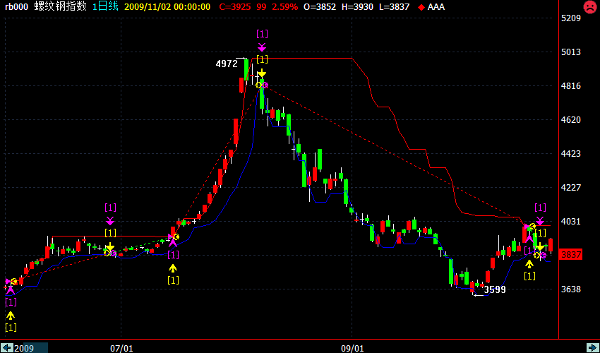 如果价格升破上轨时,就是买入信号;反之,如果价格跌破下轨时,就是卖出信号。由于其上轨和下轨是用最高价和最低价计算出来的,所以一般情况下,价格很少同时升破和跌破上下通道线。大多数情况下,价格是沿着上轨或下轨单边运动,或者在上轨和下轨之间运动的。